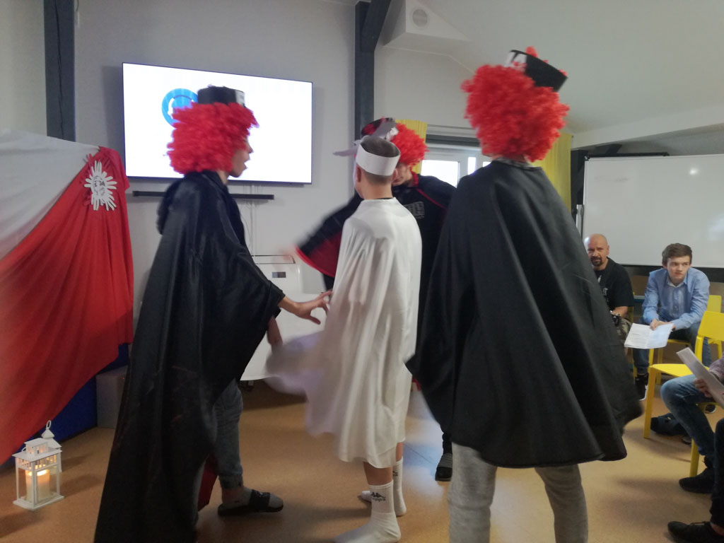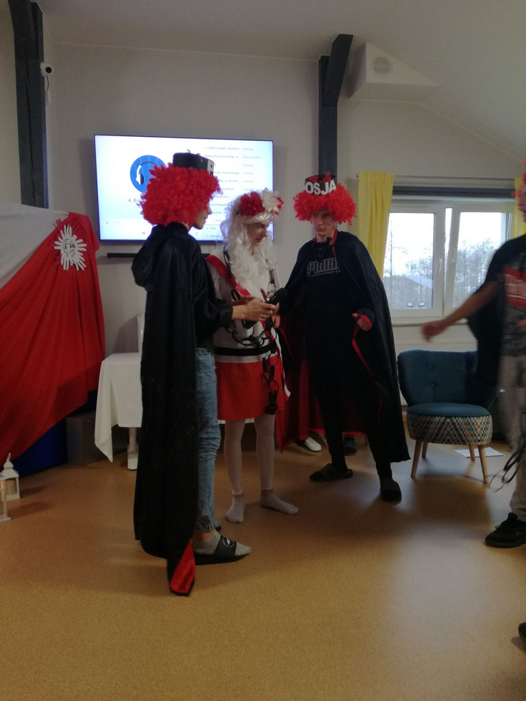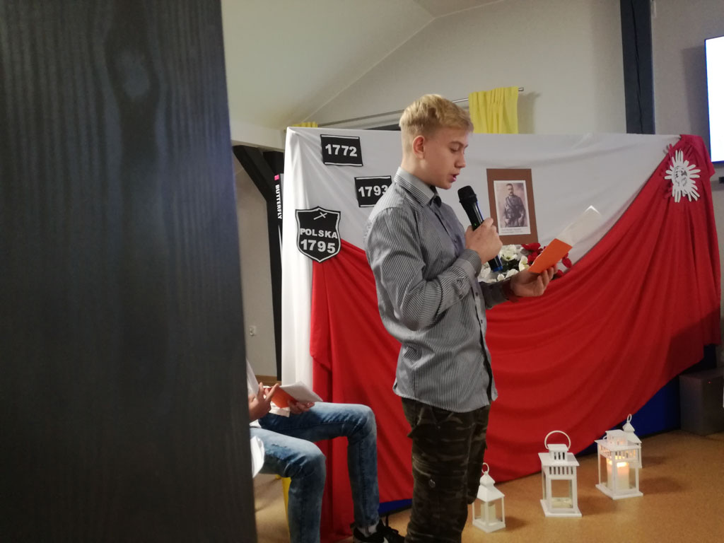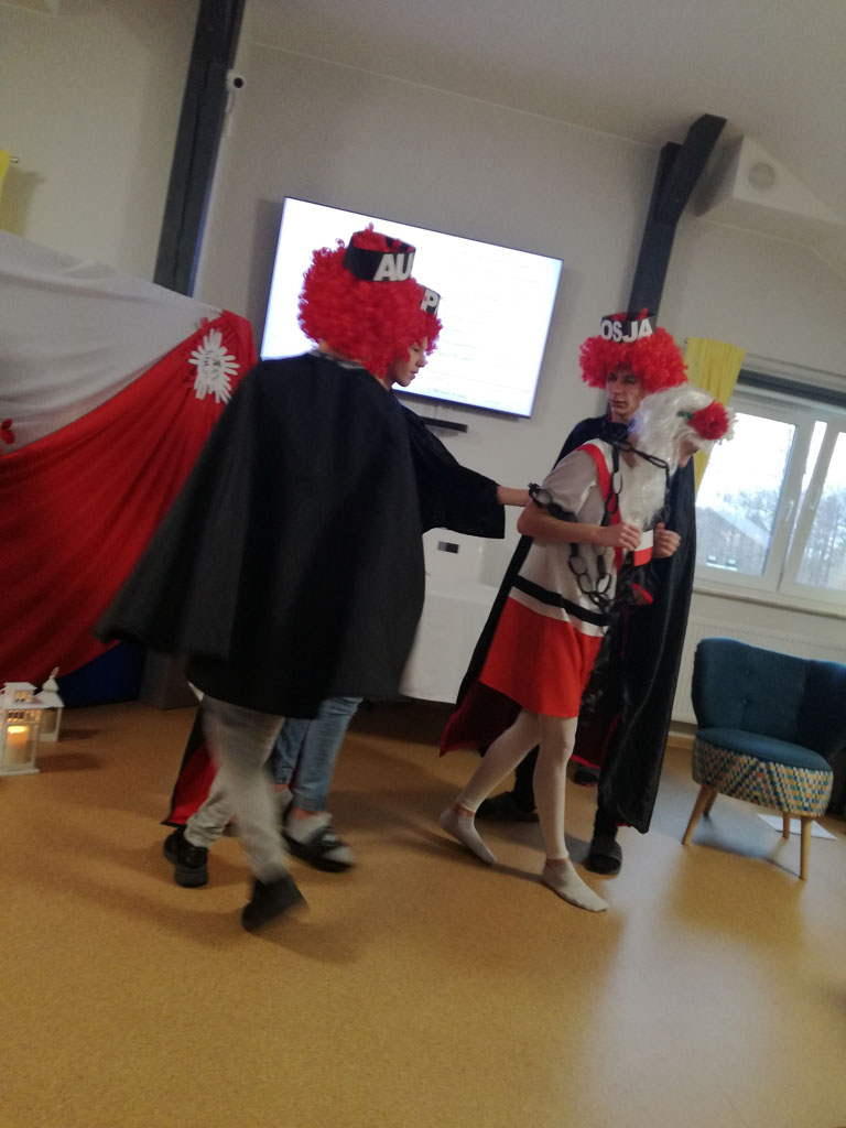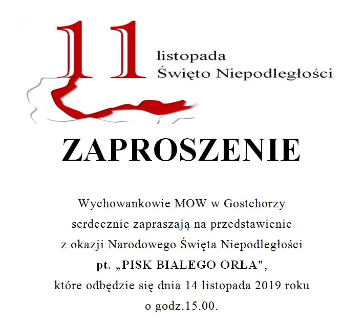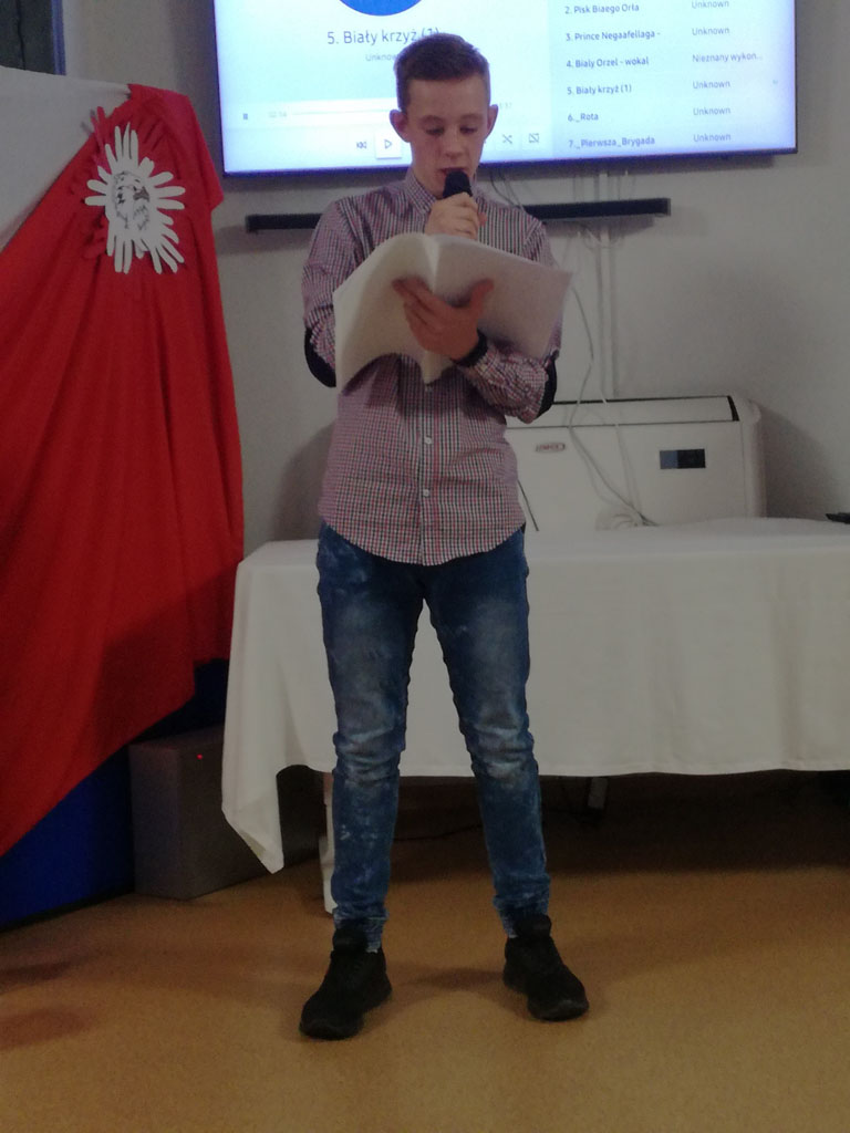 Motywem przewodnim spektaklu był pisk białego orła. To wyjątkowe przedstawienie odbyło się z okazji 101 rocznicy odzyskania przez Polskę niepodległości. Było ono ciekawą lekcją historii, ukazującą walkę Polaków o niepodległość i odzyskanie po 123 latach niewoli upragnionej wolności, a także hołdem złożonym wszystkim tym, którzy oddali życie za wolną Polskę. Występ naszych kolegów dostarczył nam wielu wzruszeń, a wspólny śpiew patriotycznych pieśni obudził ducha patriotyzmu i stał się bodźcem do pokazania, że jesteśmy Polakami, czujemy się związani z Ojczyzną, jej historią, kulturą i tradycjami.